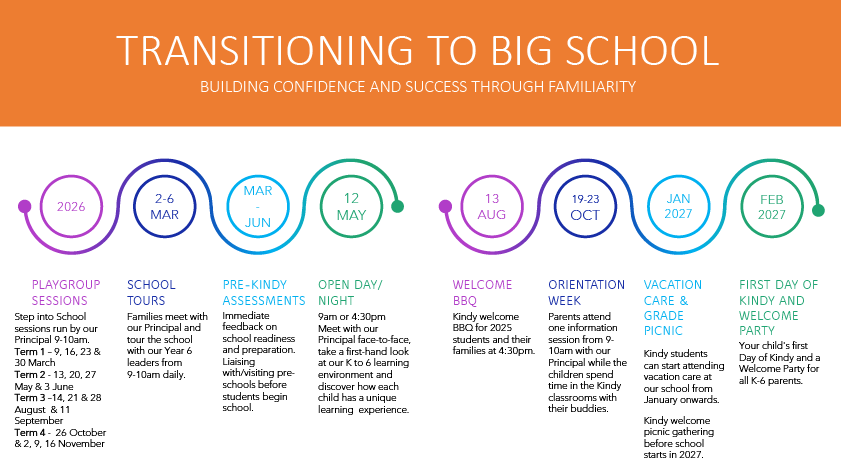 Enrolled Kindy 2027 students and their families are welcome to meet for a fun social evening on 13th August 2026 at 4:30pm! Invitations will be emailed out to all enrolled families prior to the event.